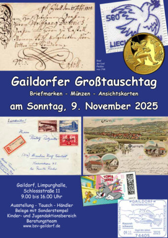Die Schenkenstadt Gaildorf ist wieder Austragungsort des Gaildorfer Tauschtags. Sammler aus Nordwürttemberg und dem angrenzenden Bayern nutzen die vielfältigen Angebote für Sammler: Briefmarken, Ansichtskarten, Münzen und Telefonkarten sind hier ein gefragtes Sammelgut. In der Gaildorfer Limpurghalle wartet am Sonntag, den 09.11.2025 aber nicht nur ein breites Handelsangebot und eine Briefmarkenschau auf die Besucher. Informationen rund um das Briefmarken- und Münzsammeln bietet auch der Landesverband Südwestdeutscher Briefmarkensammler und der ausrichtende Briefmarkensammlerverein Gaildorf. Mit dabei ist auch die Deutsche Post. Umschläge mit dem Sonderstempel Vogel des Jahres können erworben und Post verschickt werden. Viele gute Gründe für einen Abstecher nach Gaildorf.